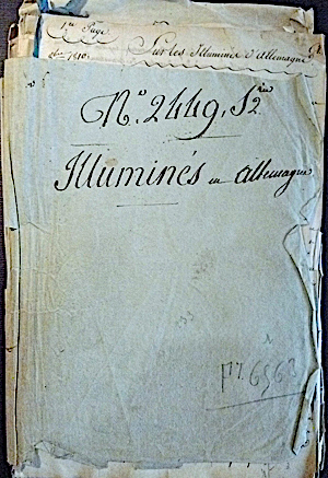 Le dossier intitulé "Illuminés en Allemagne", conservé aux Archives nationales, contient une riche documentation sur les sociétés secrètes allemandes sous l'Empire, particulièrement durant l'année 1811. Nerval a consulté ce dossier et copié le document intitulé : "Origines et progrès des associations secrètes jusqu'en 1814", puis "Influence des associations secrètes sur les événements politiques depuis 1804 jusqu'en 1814". Il publiera ces documents, ou plus exactement leur double conservé aux Affaires étrangères, ainsi que d'autres qu'il a puisés également dans les archives confidentielles des Affaires étrangères (Dossier Illuminés AN), dans l'édition de Léo Burckart en 1839. Le document de droite porte le cachet à la cire du Tugenbund.